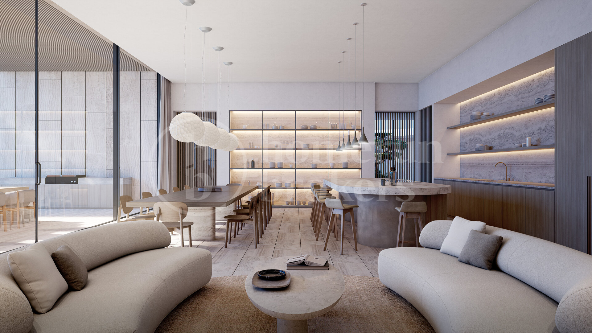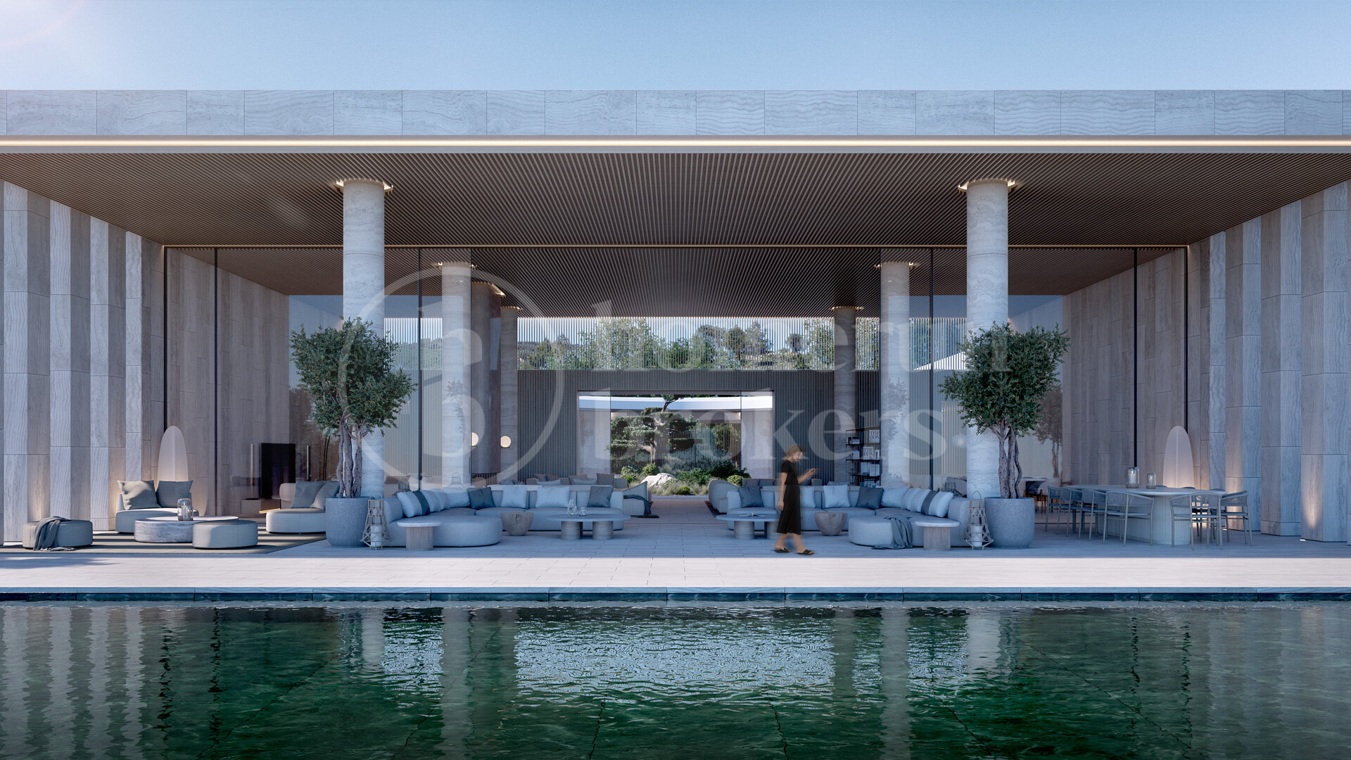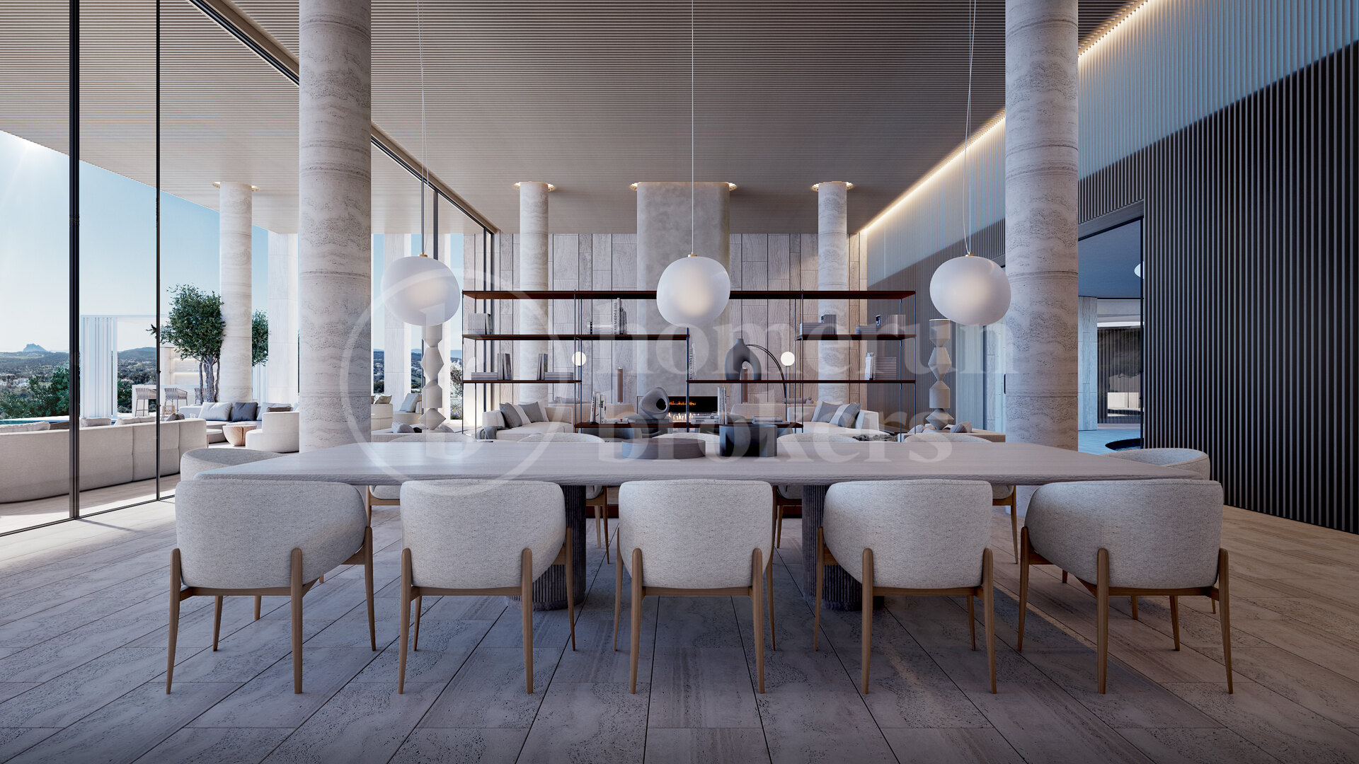 Utomhusmiljön är lika imponerande, med eleganta terrasser, nedsänkta loungedel och middagsplatser under bar himmel – allt omgivet av hållbart designade trädgårdar med mogna träd och välskötta gräsmattor. En infinitypool med utsikt mot horisonten skapar en idealisk plats för både fest och vila.