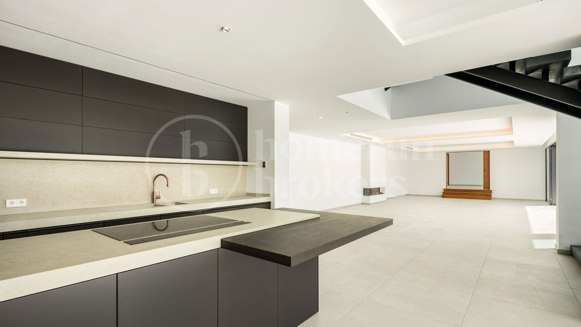 The interiors reflect a contemporary style, with high-quality finishes and a neutral color palette that conveys serenity. The open-plan kitchen is equipped with state-of-the-art Miele appliances, ideal for those who value functionality and design in their daily lives. Additionally, the home automation system, underfloor heating, air conditioning, and a four-person elevator that reaches the rooftop further enhance the modern living experience.
